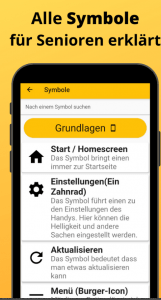 Senioren mit Smartphone ermöglicht Senioren oder Menschen, die mehr über das Smartphone wissen möchten, viele neue Dinge zu lernen. Die App ermöglicht das Erlernen von den wichtigsten Symbolen(Icons), WhatsApp, Steuerungen, Internet, andere wichtige Apps und vieles mehr.
