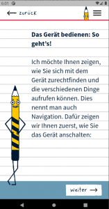 In geschützter Lernumgebung werden die wichtigsten Informationen zur Bedienung eines Geräts Schritt für Schritt erklärt. Vom ersten „Tippen“ und „Wischen“ bis hin zum Installieren von Apps und der Kommunikation über Messenger. Erklärvideos vermitteln das Wissen verständlich – diese können immer wieder angeschaut und vor- und zurückgespult werden. Anschließend können Sie das Gelernte direkt einüben.